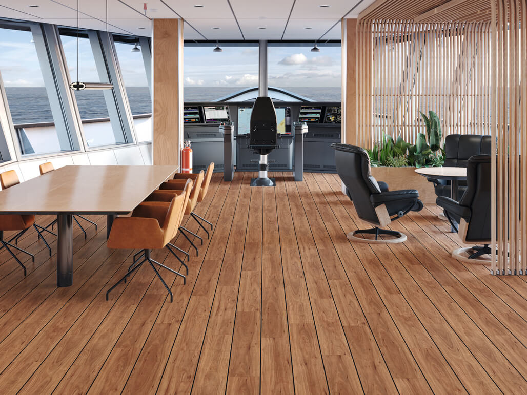 Voyager Teak has a rich, warm grain detail with beautiful markings synonymous with this nautical woodgrain classic. Pair with bold stripping in a Deck Block pattern for a classic floor design.