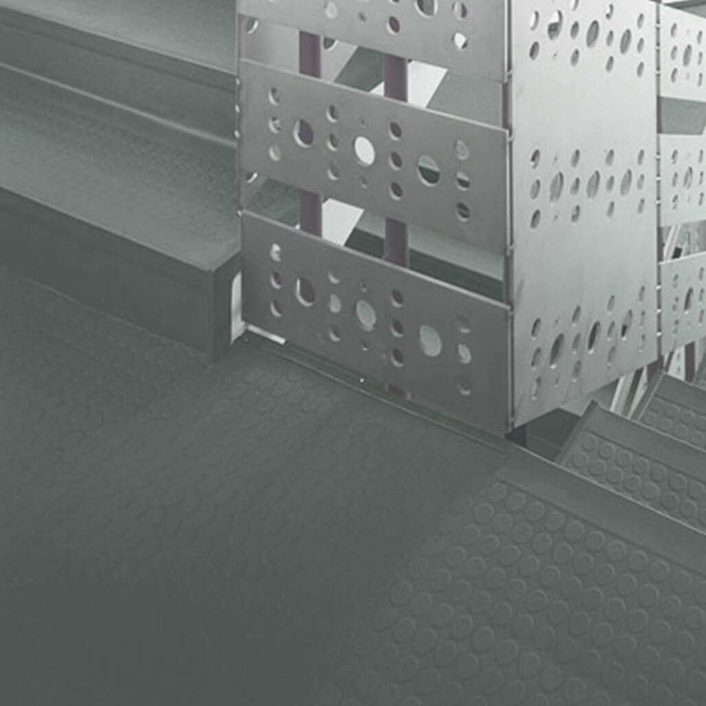 Norament 920 is an one-coloured, extremely fire-resistant and halogen-free rubber flooring for extremely heavy traffic areas. Norament 920 is largely resistant to oils and greases and offers all the advantages our customers rightfully expect from a resilient floor covering, too. Exposure to extreme stresses impairs neither the functionality nor its visual appearance. This stairtread has an one-colored, classic round pastille surface.